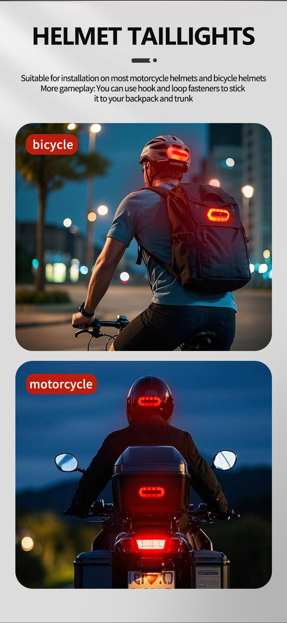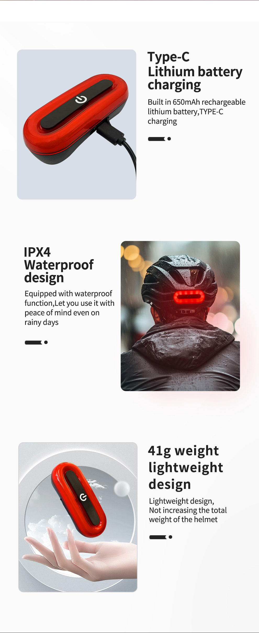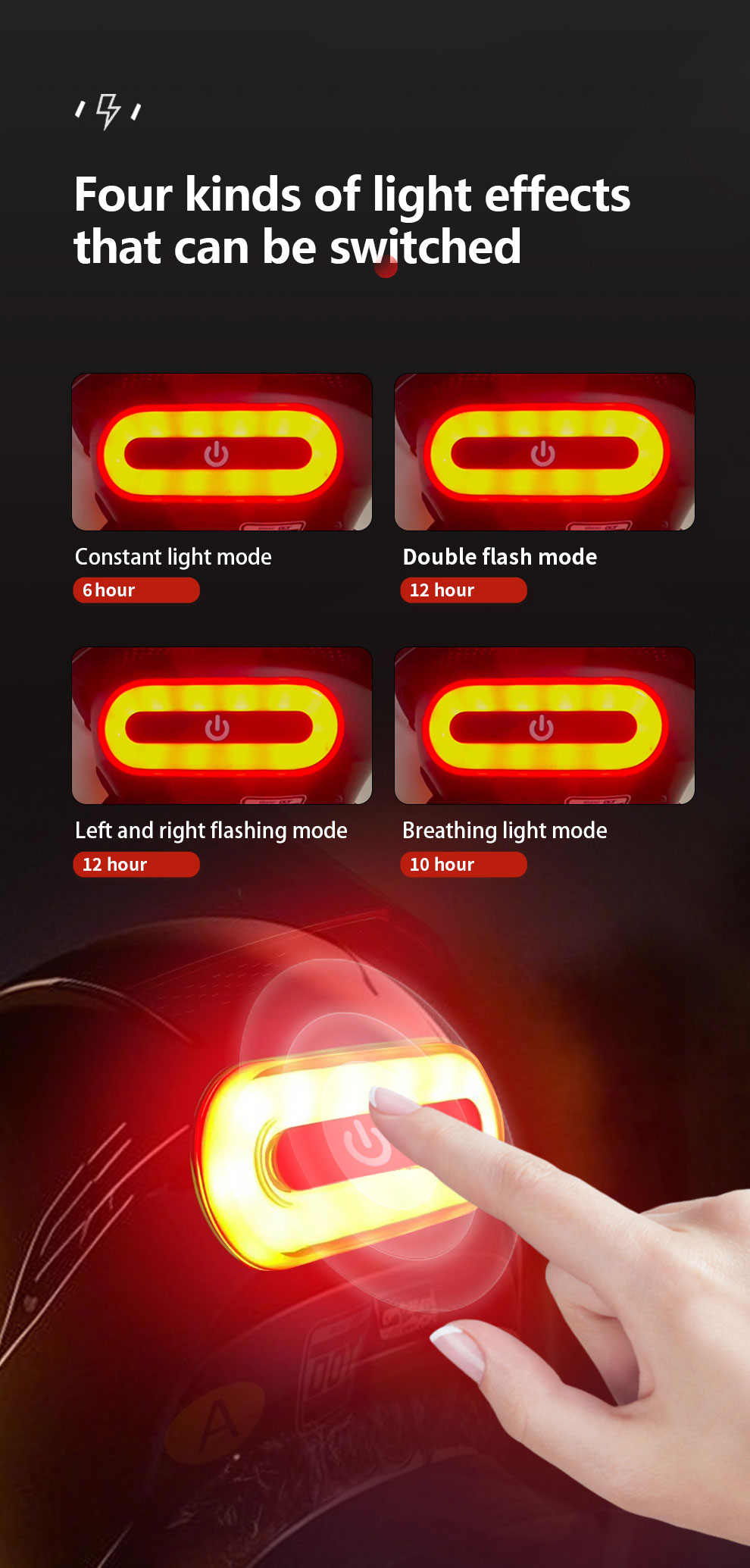 1.Constant-On Mode 2.Dual-Flash Mode 3.Alternating Flash Mode (Left Right) 4.Breathing Mode